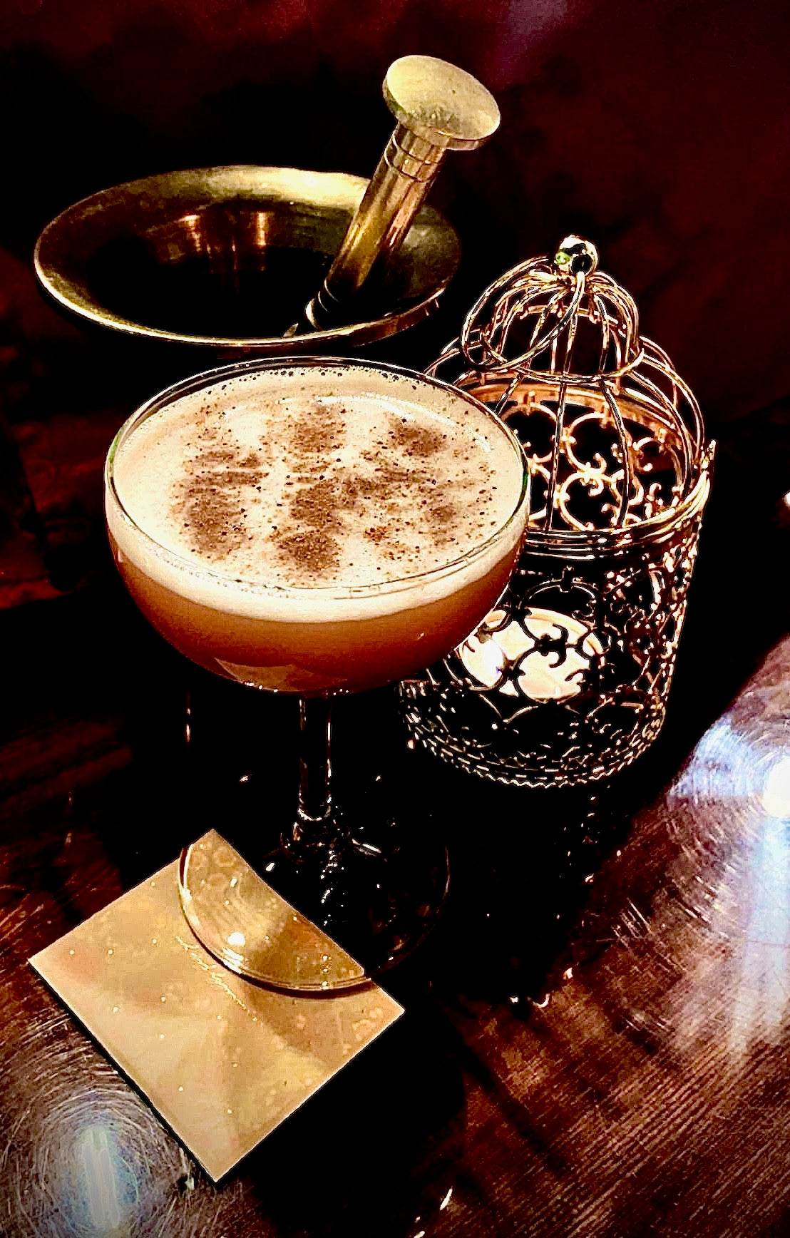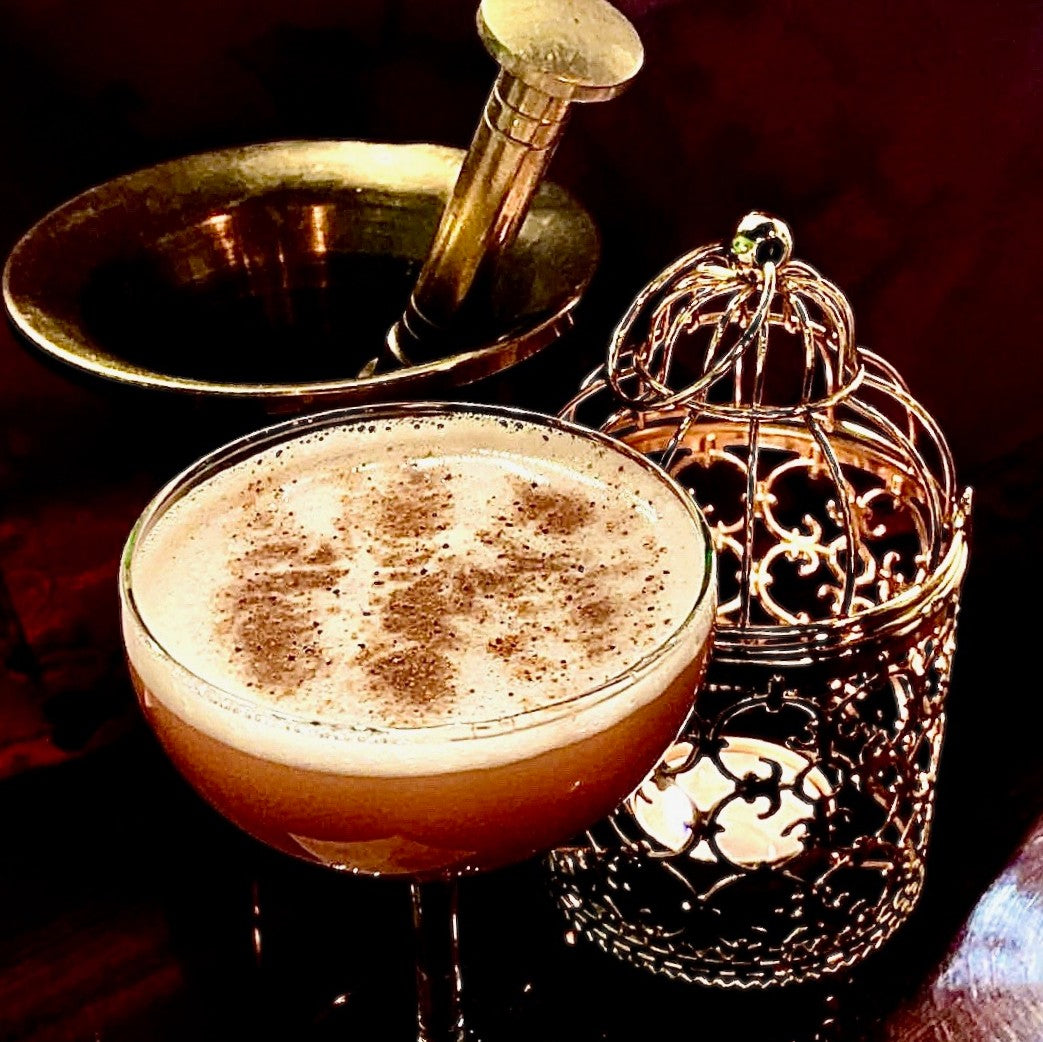 Some things are best not spoken aloud. Barrel-Aged Gin, Glayva, brandy-based cherry shrub and meringue foam. Served with a secret note from the last person who ordered this drink.