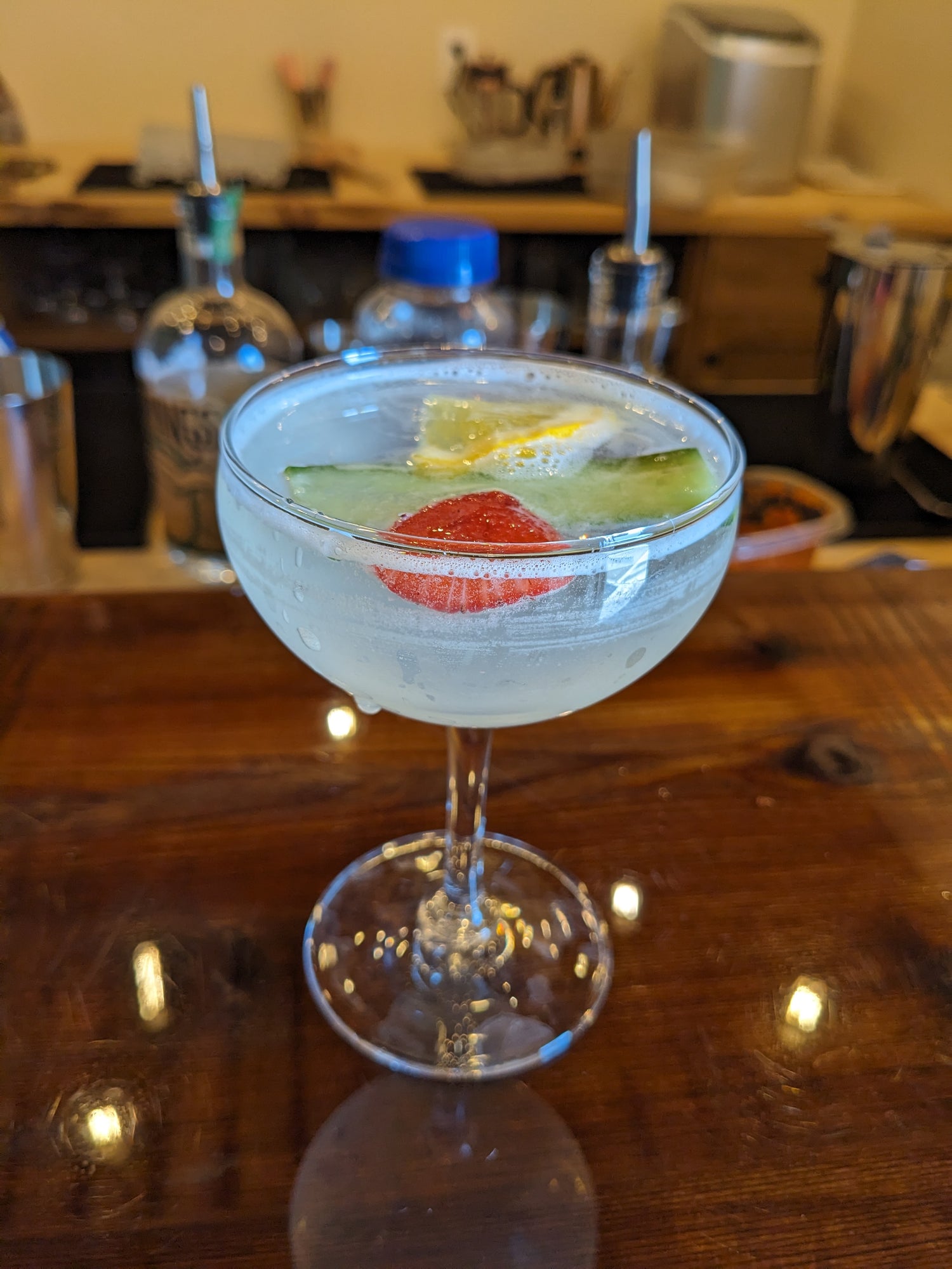 Garnish with cucumber ribbon, ¼ orange wheel, sliced strawberry.